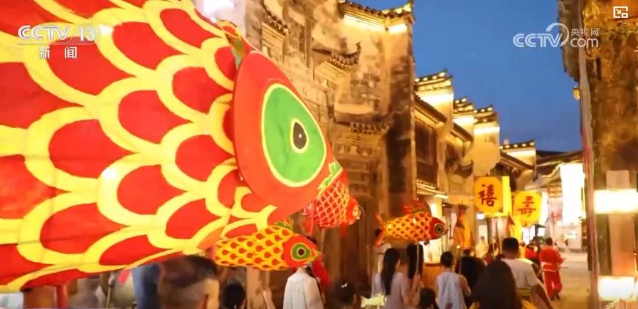 除此之外,当地还以自己独有的地方资源优势,以“非遗+古建”的创新融合,成为江西夜经济的新地标。晚上7点,上饶弦高城的灯光渐次亮起。百米长的鱼灯队伍从徽州古戏台前蜿蜒而出。游客们手持小鱼灯加入巡游队伍,光影在水巷与石板路间流淌。