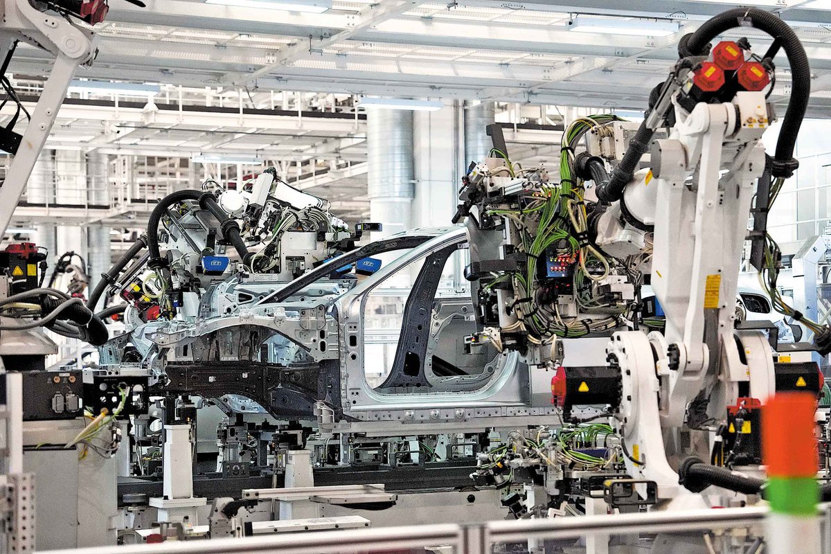 一辆汽车正在北京一条自动化生产线上进行组装。图片来源:新华社