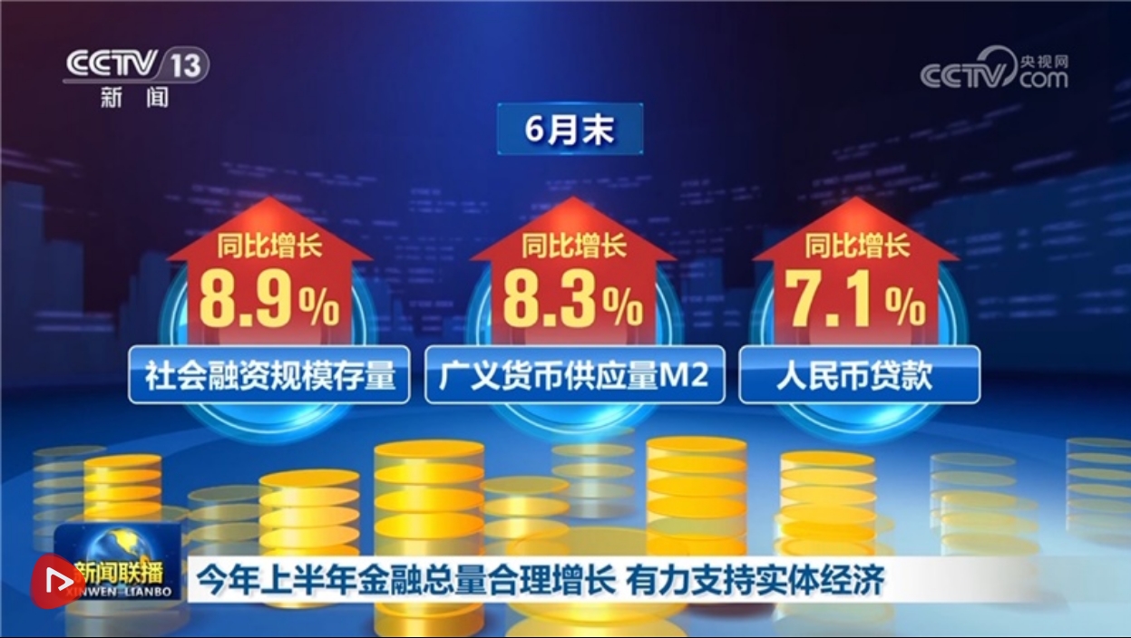 上半年,金融总量合理增长。6月末,社会融资规模存量同比增长8.9%,广义货币供应量(M2)同比增长8.3%,人民币贷款同比增长7.1%。