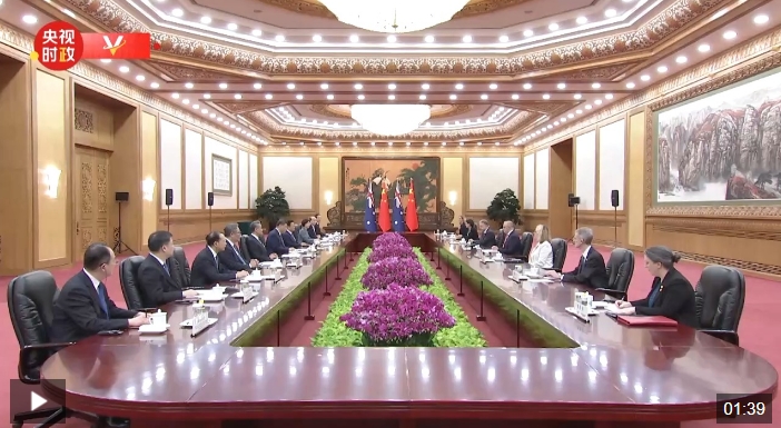 阿尔巴尼斯说:“主席先生,我很高兴今天再次同您会面,澳大利亚珍视同中国的关系,将继续以冷静和一贯的方式推进双边关系,这符合我们的国家利益。从这点来说,我们的双边关系非常积极,这符合我们的国家利益,也符合本地区的利益。”