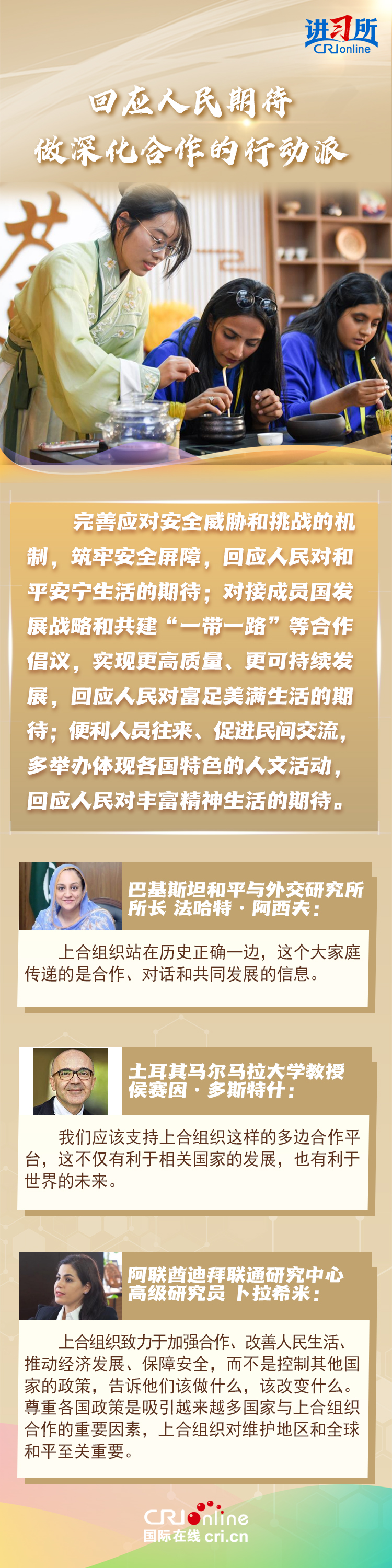 “让‘上海精神’持续照亮构建上海合作组织命运共同体之路。”上海合作组织成立24年来,始终秉持“上海精神”,成功走出了一条顺应时代潮流、契合各方需求的区域合作道路,树立起新型国际关系的典范。在国际人士眼中,上海合作组织站在历史正确一边,致力于建设一个更加平等,更加包容,更加公平公正的世界,对维护地区和全球和平至关重要。