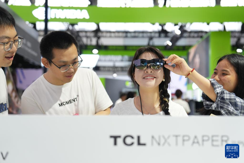 7月19日,几位参观者在数字科技链展区的TCL公司展台体验一款眼镜。