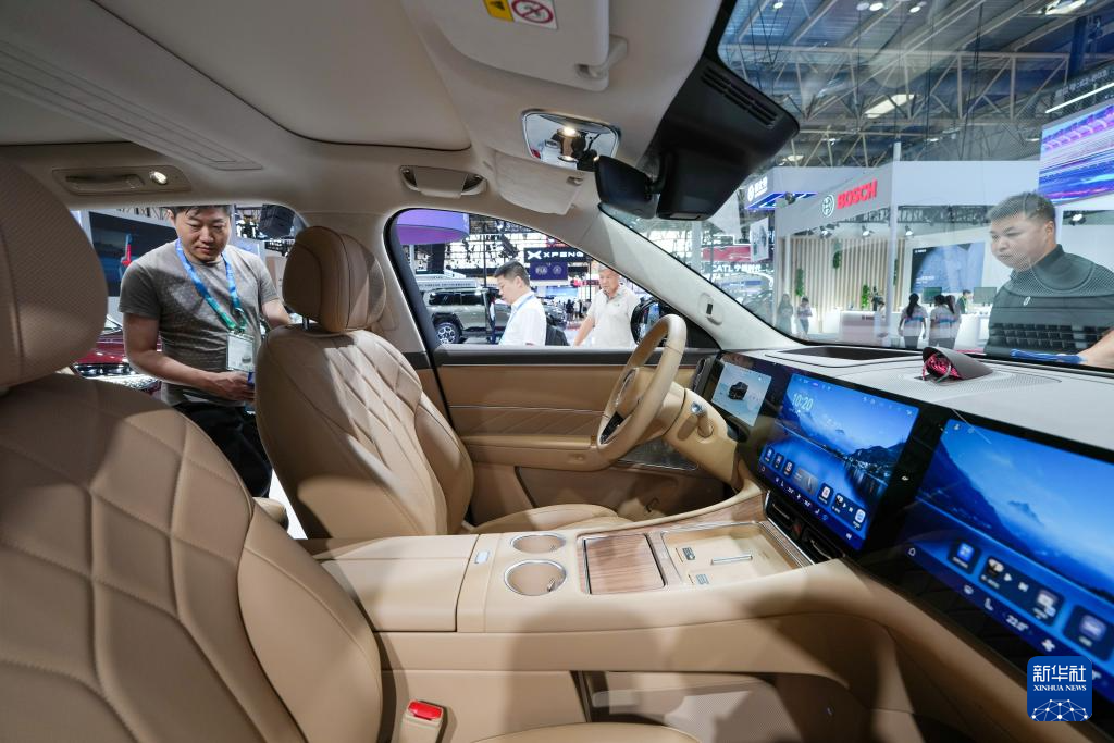 7月19日,参观者在智能汽车链展区的问界汽车展台参观展出的新能源汽车。