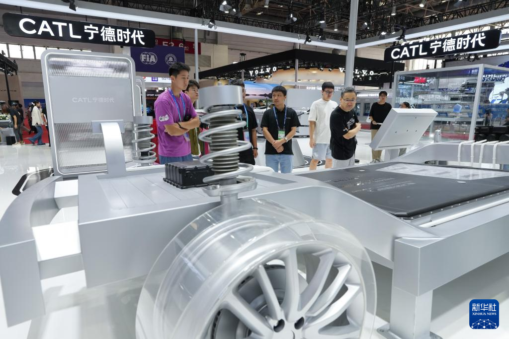 7月19日,参观者在智能汽车链展区的宁德时代展台参观展出的神行超充电池。