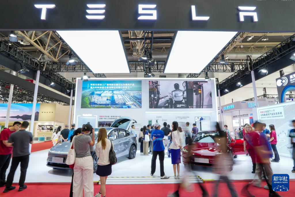 7月19日,参观者在智能汽车链展区的特斯拉展台参观。