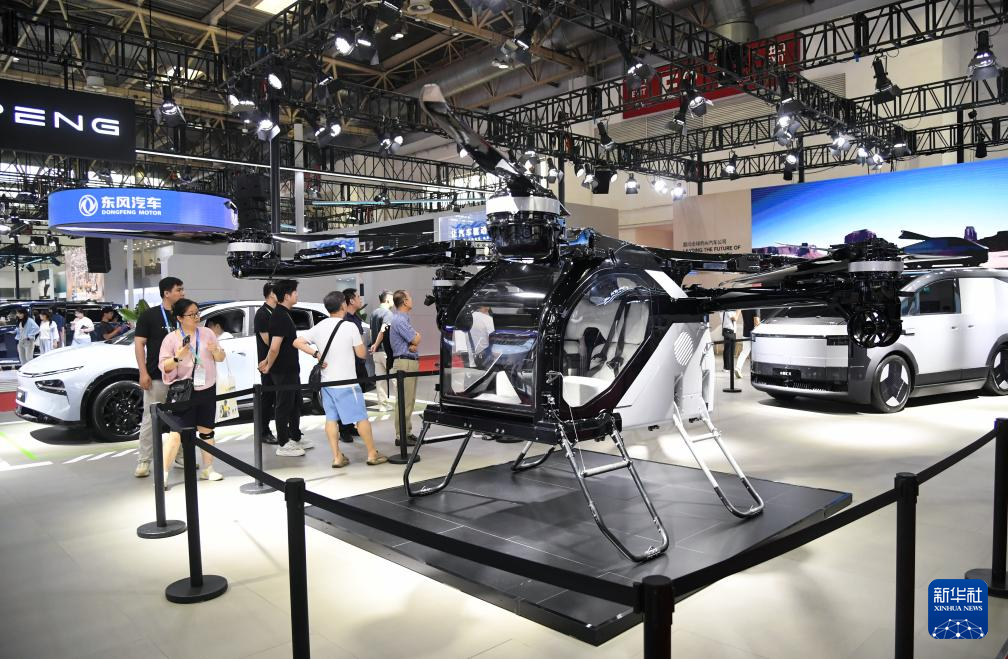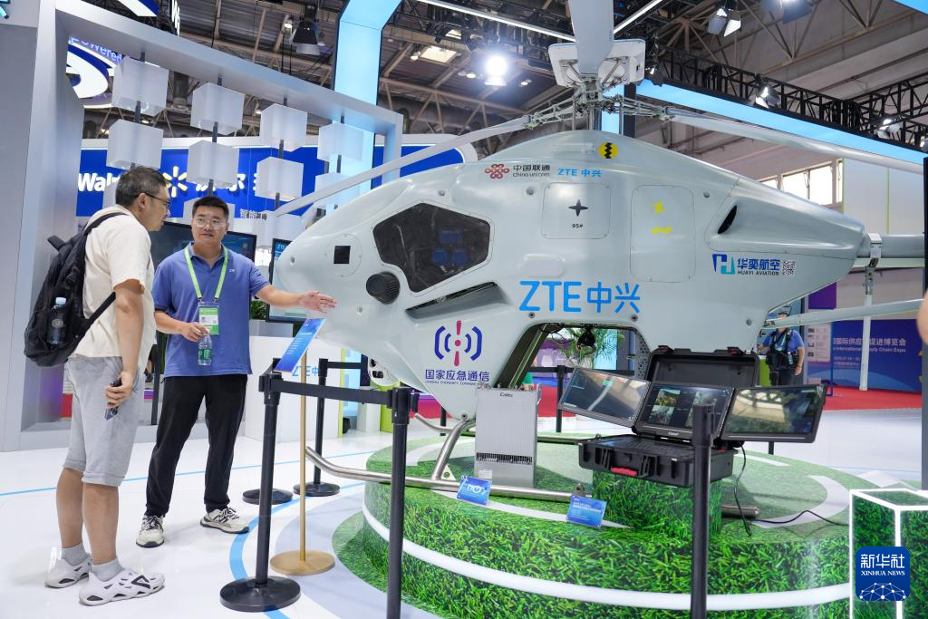 7月19日,参观者在数字科技链展区中兴通讯展台参观大型无人直升机应急救援平台。