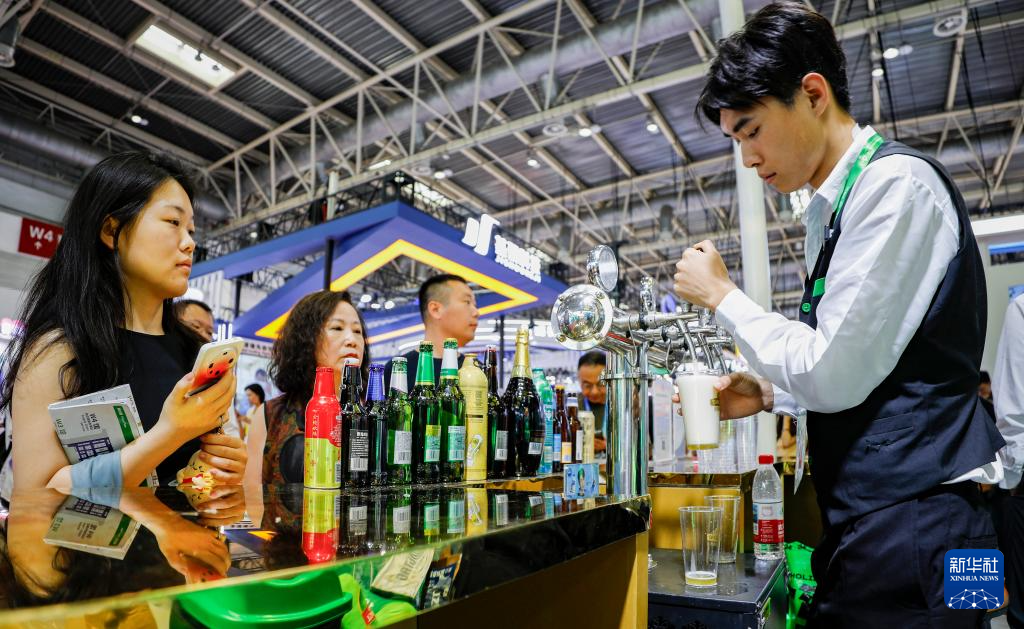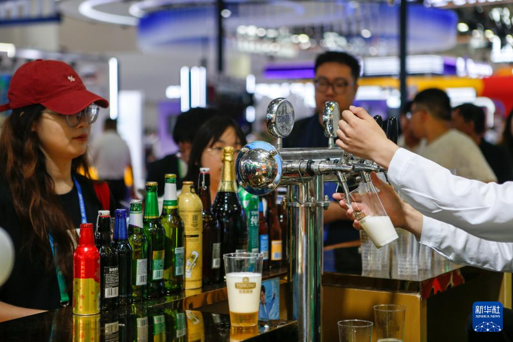 7月19日,观众在青岛啤酒展台品尝啤酒。