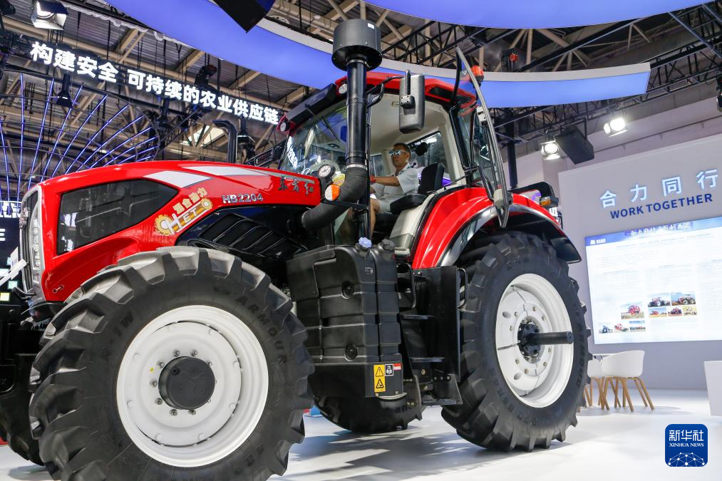 7月19日,观众在国机集团展台体验一款混合动力东方红拖拉机。
