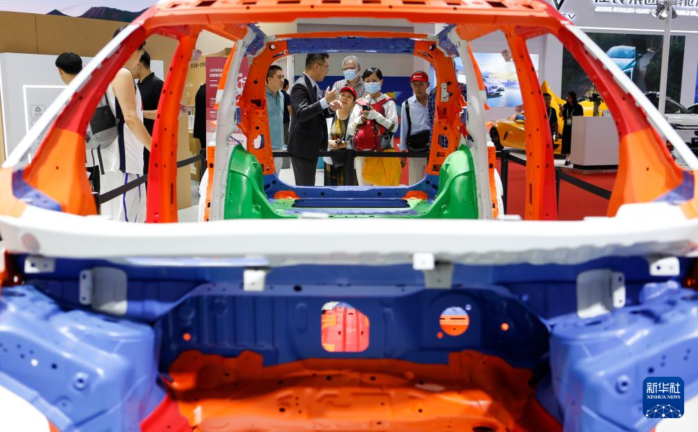 7月19日,参观者在智能汽车链展区的力拓公司展台参观一款纯电动白车身。