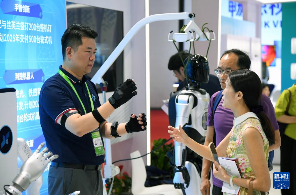7月19日,工作人员(左一)在第三届中国国际供应链促进博览会数字科技链展区与观众交流。