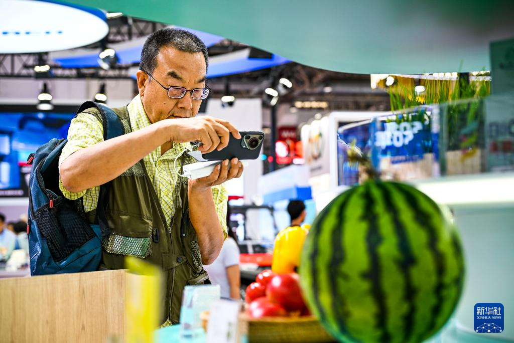 7月19日,观众在第三届链博会绿色农业链展区内拍照。