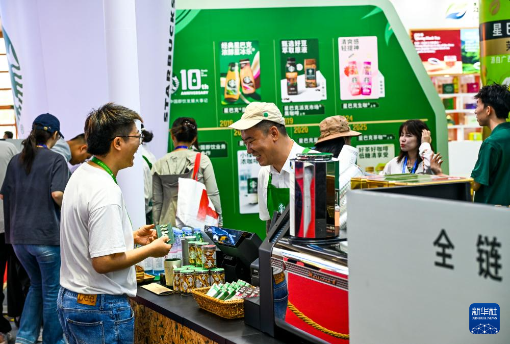 7月19日,观众在第三届链博会健康生活展区星巴克展台前了解产品。