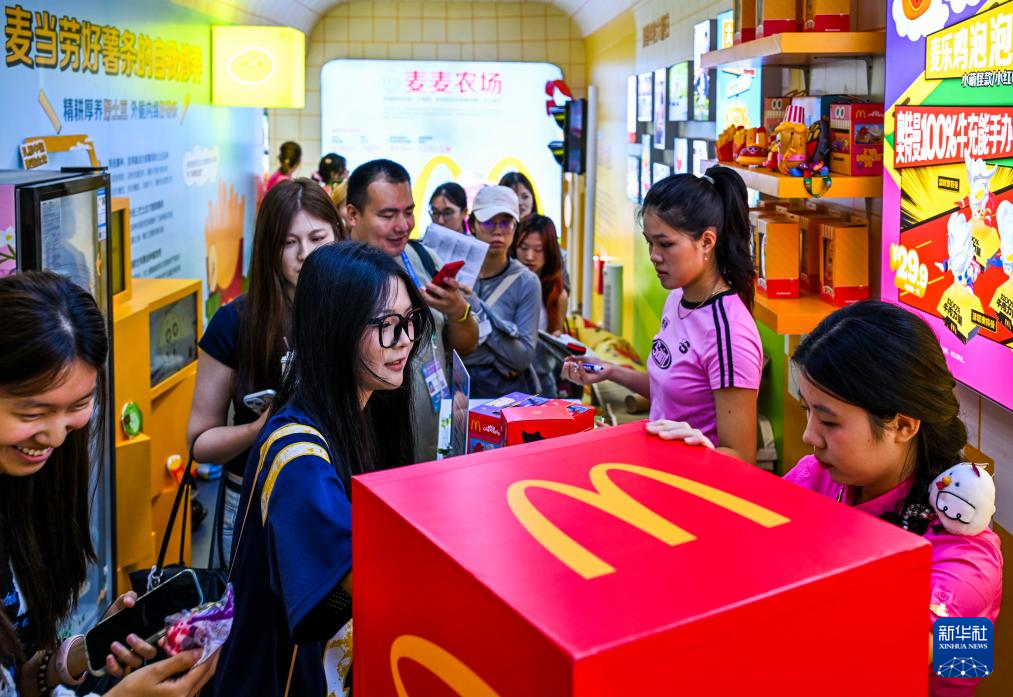 7月19日,观众在第三届链博会绿色农业链展区麦当劳展台内参与抽奖互动。
