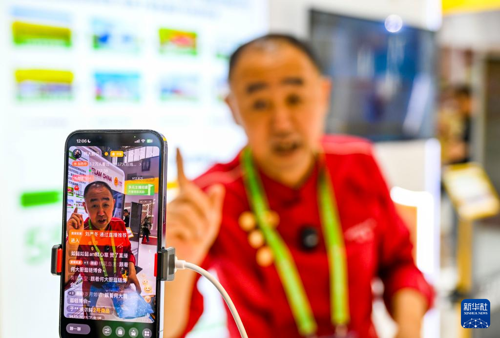 7月19日,工作人员在第三届链博会绿色农业链展区正大集团展台内直播介绍产品。