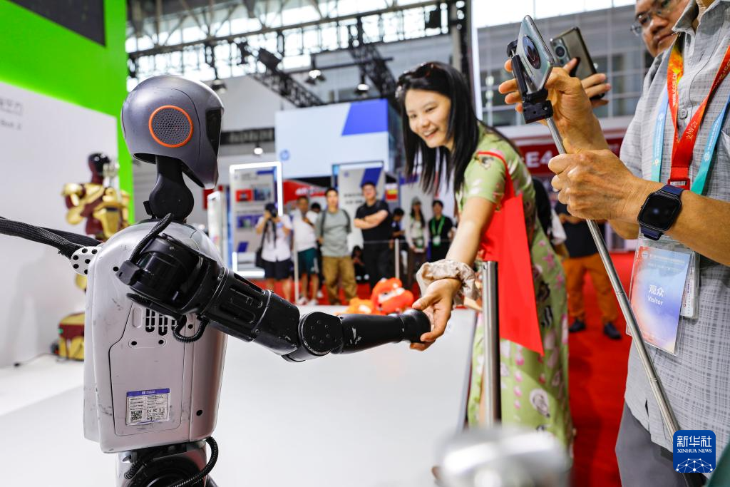 7月19日,观众在第三届链博会数字科技链展区与机器人握手。