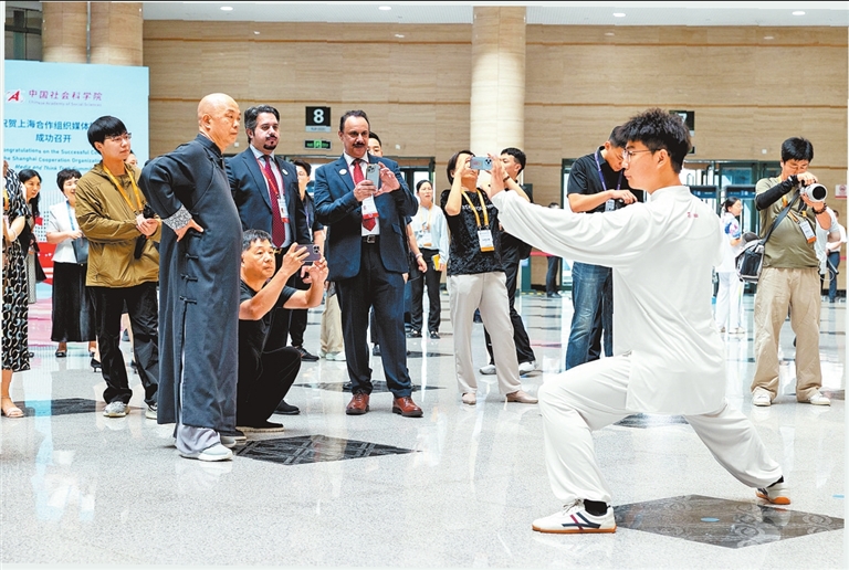 峰会现场,与会代表观看太极拳表演。 新华社发