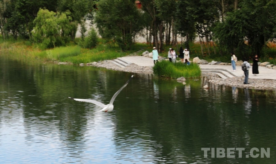 中国西藏网讯 波光滟潋,水鸟翱翔,林木丰茂,花朵绽放……7月25日,在西藏自治区拉萨市两岛内河绿色生态廊道工程新建的廊桥附近,高原的夏日美景令人心旷神怡。