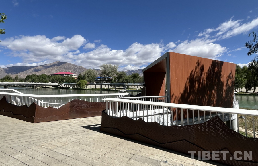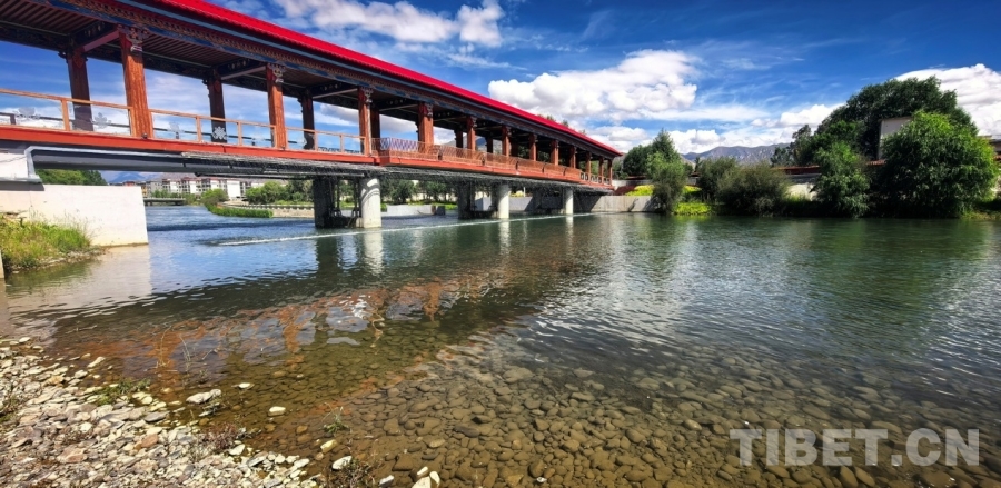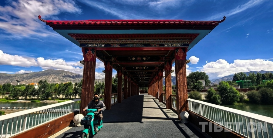 图为拉萨两岛内河绿色生态廊道上连通南北岸的廊桥 摄影:刘莉