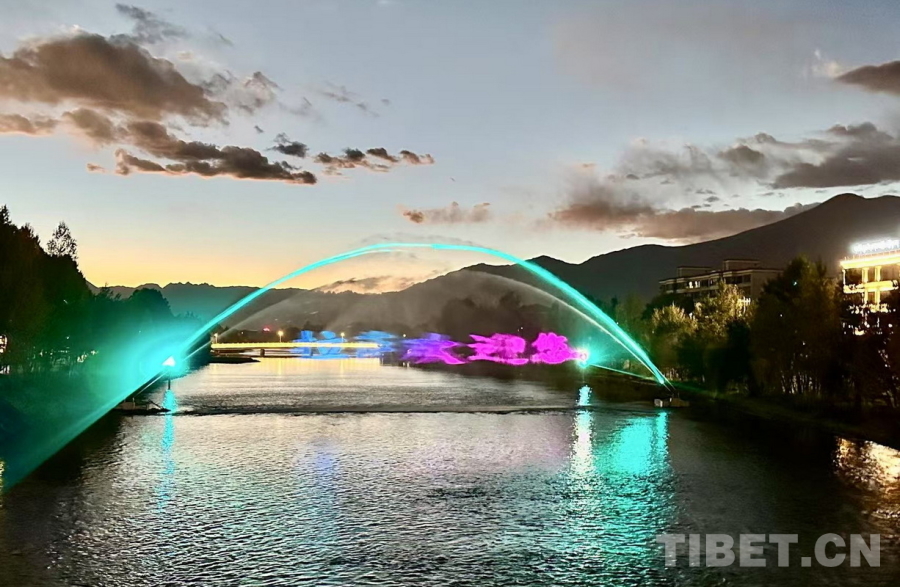 图为拉萨两岛内河绿色生态廊道提升工程新建的水幕电影在傍晚时分亮起 拉萨市水利局供图