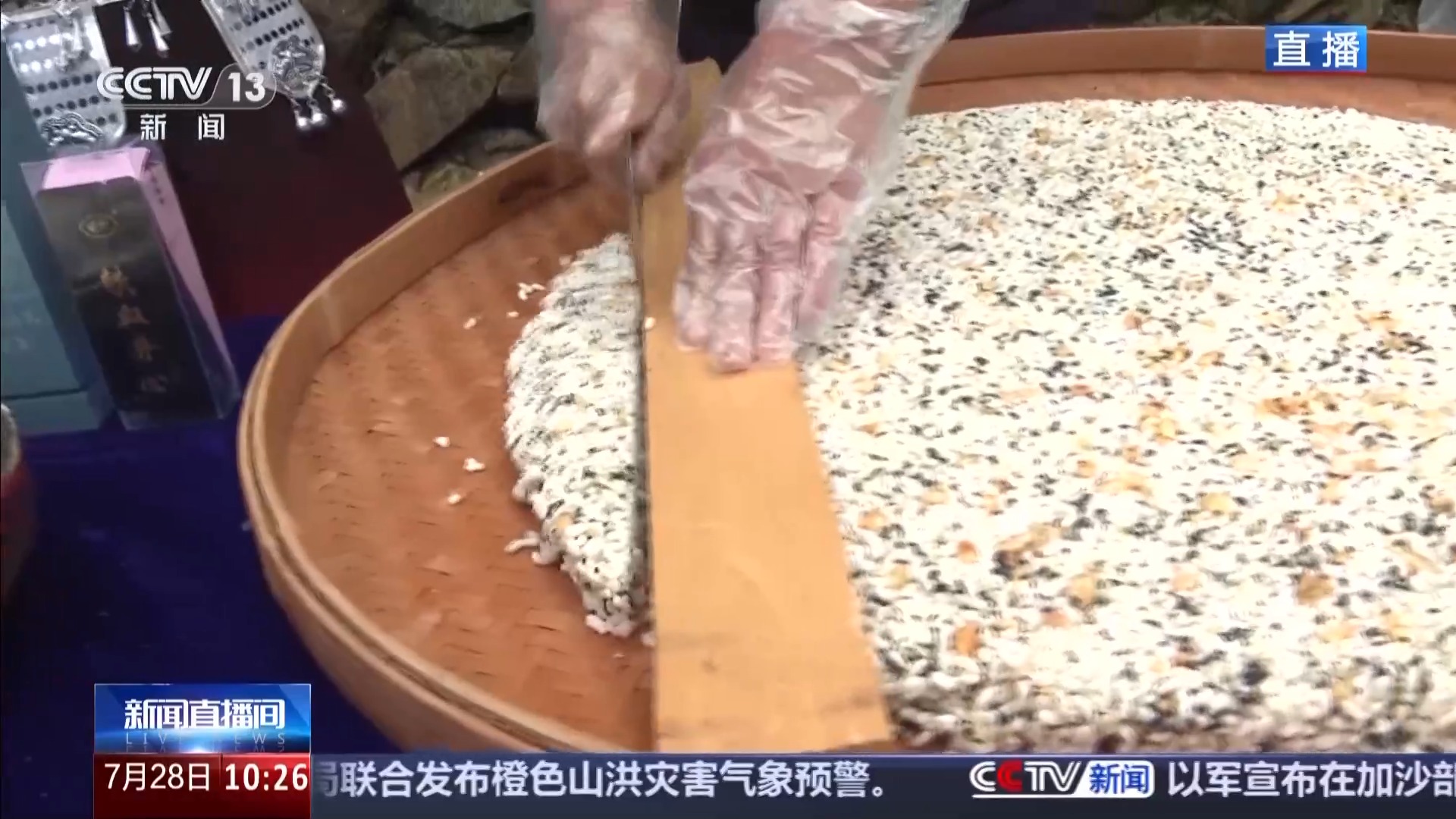 游客还可以在一旁的市集品尝当地的美食,“米香”以糯米为主要原料,花生、芝麻等为佐料,经过蒸、炸等烹饪工序后,压制切块制成。