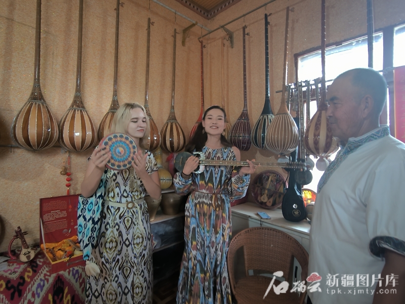 7月28日,在新和县依其艾日克镇加依村,俄罗斯籍网络达人梅丽莎(左)和网络名人古丽皮亚·买买提依明(中)正在体验民间手工乐器。石榴云/新疆日报记者 甘兴华摄