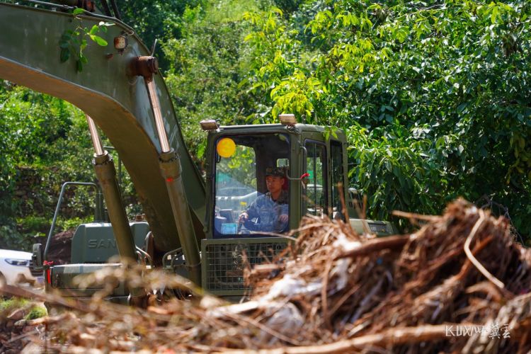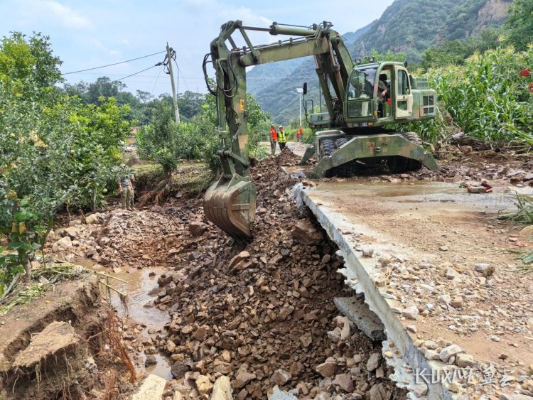 8月1日,解放军某部工兵部队正在修复兴隆县六道河镇五道河村通往朱家河村的损毁道路。通讯员 张达宁 摄