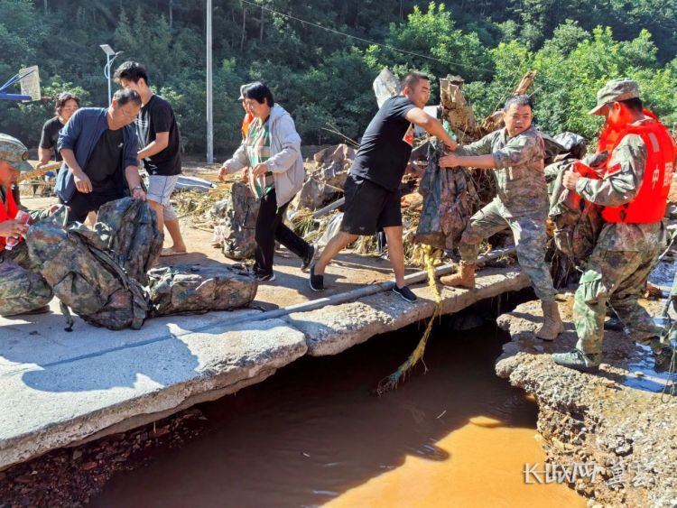 8月1日,武警河北总队承德支队官兵和兴隆县民兵共同向六道河镇朱家沟村运送应急发电设备。通讯员 张达宁 摄