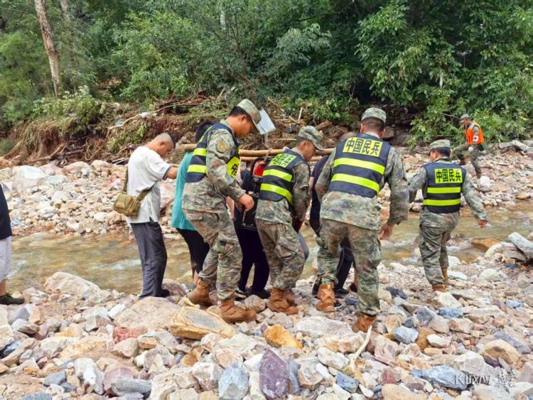 8月1日,武警河北总队承德支队官兵正在蹚水前往兴隆县六道河镇朱家沟村最高处居民家中。长城网·冀云客户端记者 姚杰 摄