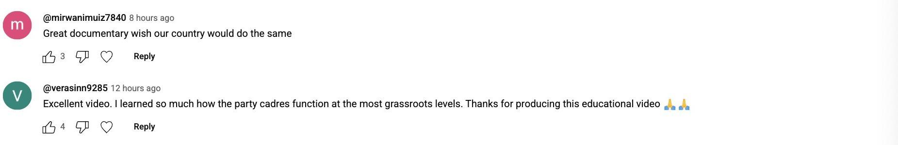 他还指出:“在中国,基层党组织书记无处不在。他们身兼数职,是社区的主心骨,是协调矛盾的能手,是拆迁分房的‘经纪人’,也是百姓身边的社工。看完此片我最深刻的感受是,中国共产党是一种极为独特的组织,它真切关心人民,无论是在东部富庶的城市,还是在西部曾经落后的乡野。中国之所以能实现如此非凡的历史性转变,根本原因就在于中国共产党。”