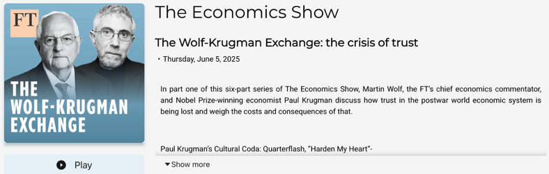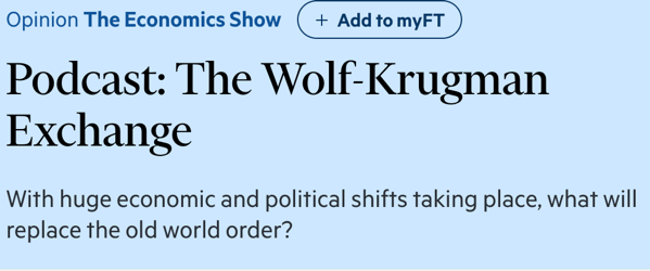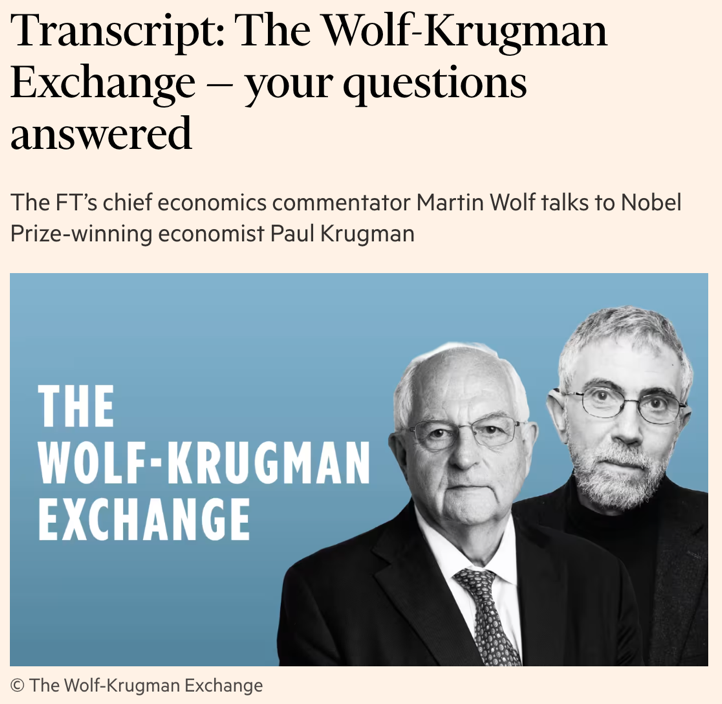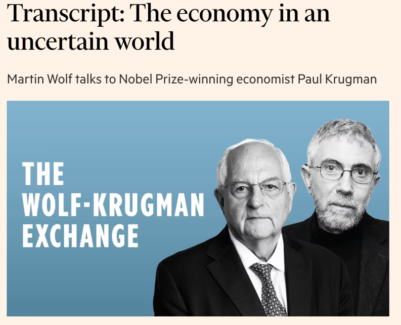 △《金融时报》在对完整六期访谈的总结报道中,深入总结了克鲁格曼与沃尔夫两人对当前制度退化、全球治理、选民心理的批评视角
