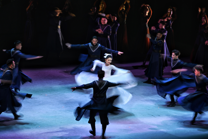 新疆木卡姆艺术集歌、舞、乐于一体。这部舞剧高潮时刻,盛大的婚礼歌颂着爱情,弹拨尔、热瓦普等乐器依次奏响,刀郎木卡姆、哈密木卡姆等轮番上演。演员舞姿或刚劲有力,或热闹欢愉,带领观众进入欢乐的海洋。