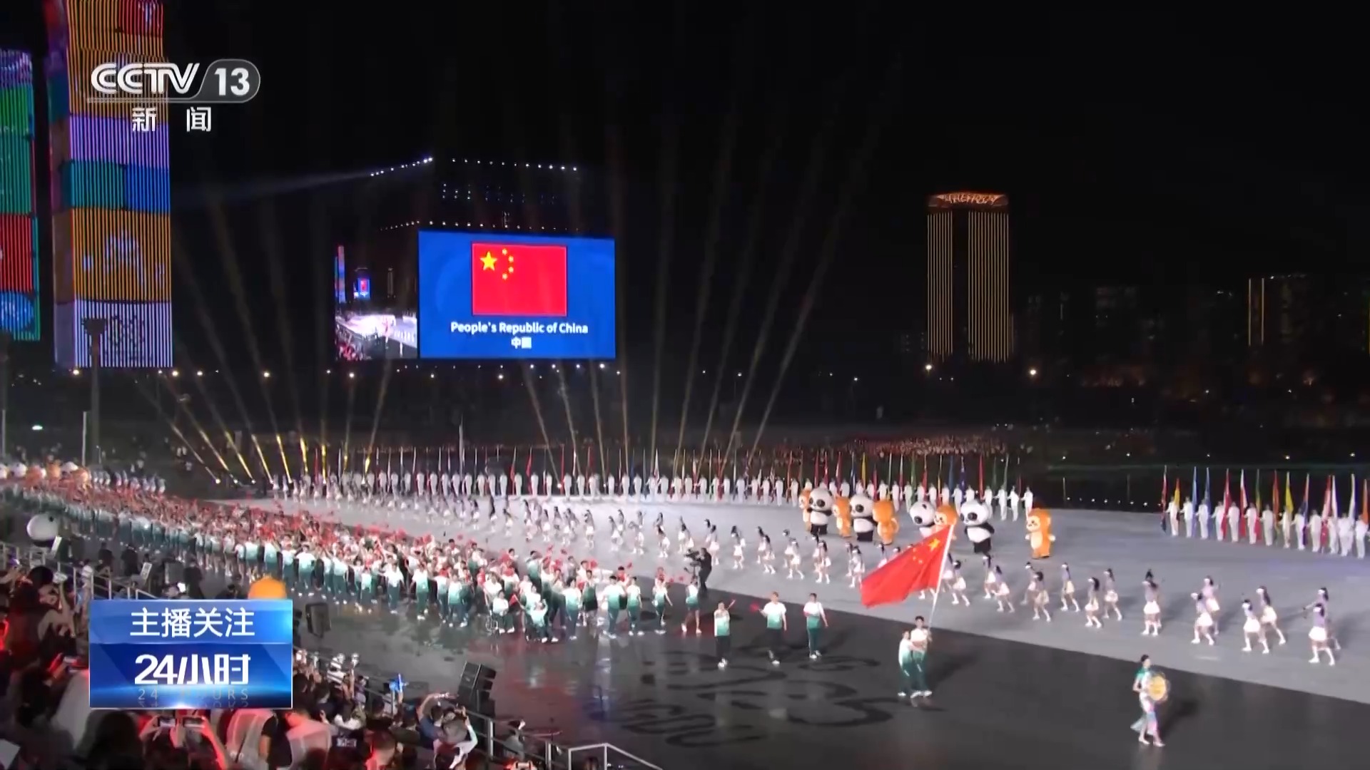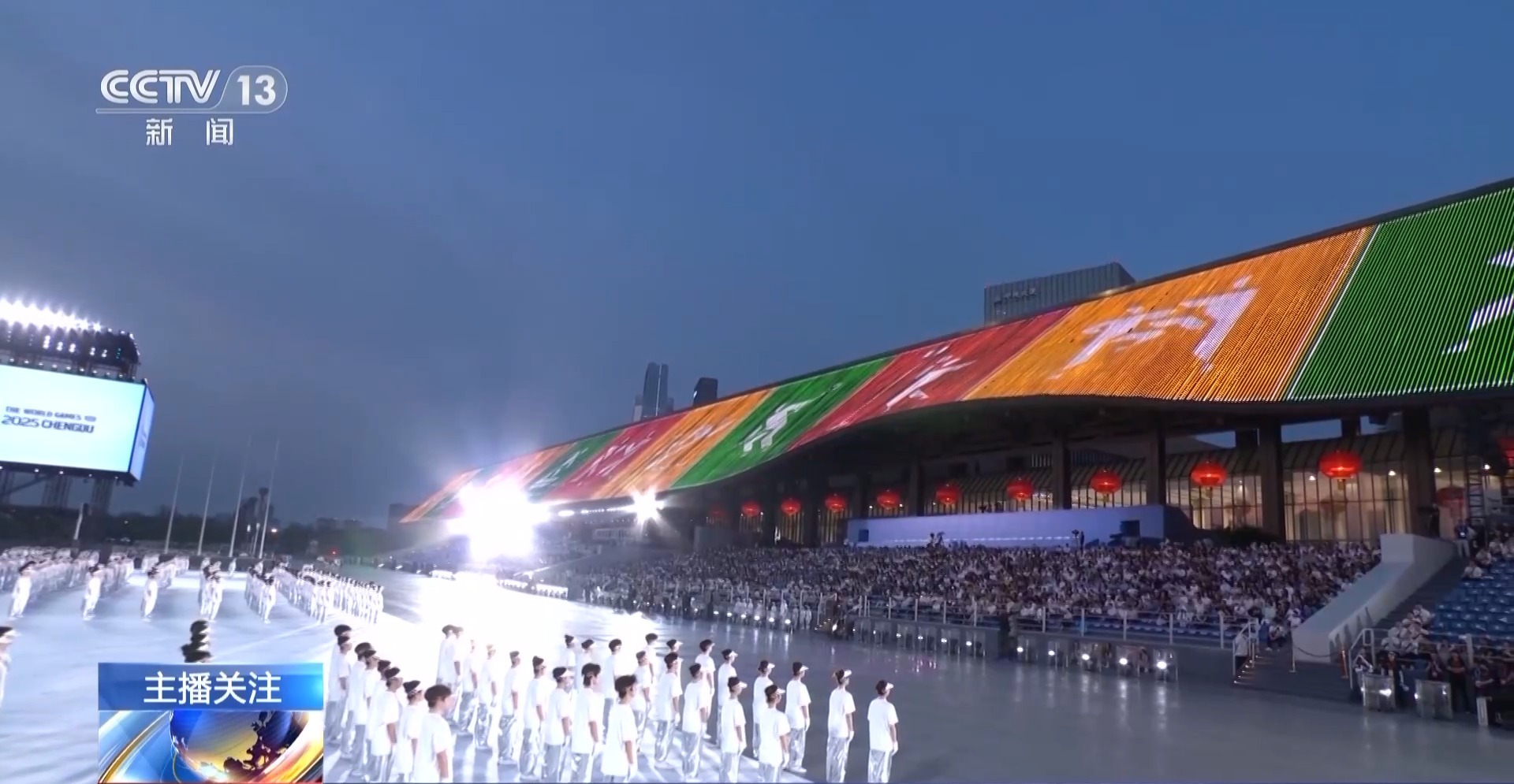 成都世运会开闭幕式总制作人 王锐祥:等于那个舞台是180度。以往在一个体育场馆里面的舞台有聚焦点,但在户外,基本上人所看到的舞台层面,都要表达,所以这个是考验我们导演、舞美、灯光师在聚焦点,怎么把我们的观众拉回这个舞台上。如果没有一个很强烈的细节感受,没有办法把观众的细节拉回中心舞台。