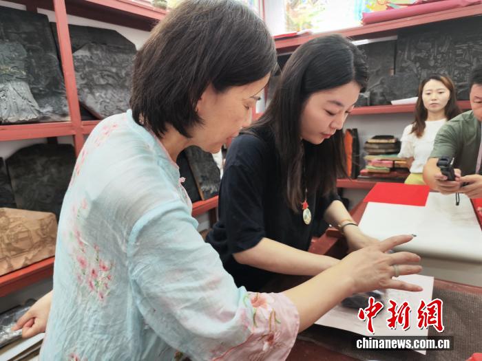“玉成号画庄”第七代传承人张宏(左)在指点媒体采访团成员“印”年画的要领。中新网刘越 摄
