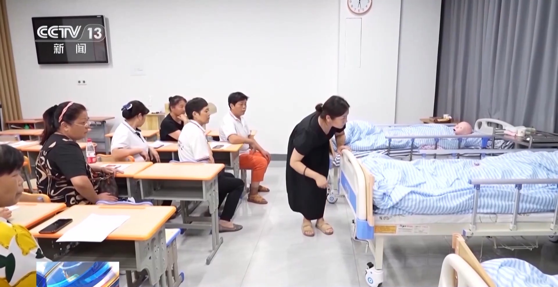 在江苏南通的这堂育婴师课上,48岁的俞海燕正在认真学习小婴儿洗澡的手法技巧。