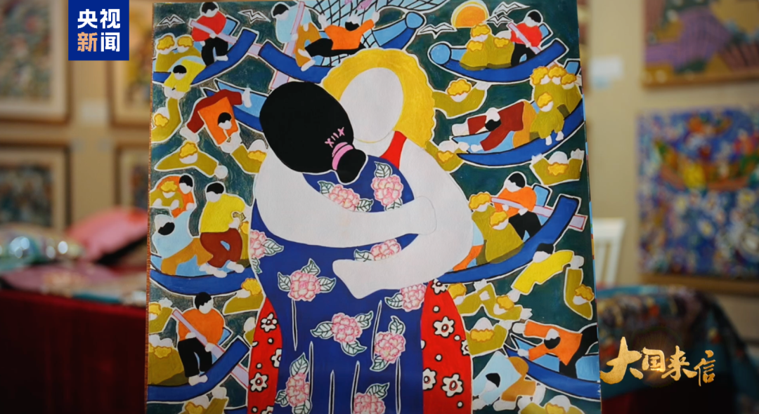 吴小飞也回赠了一件礼物。由于她是一名渔民画创作者,于是就把一幅名为《拥抱》的作品创作出来送给了对方。在她看来,这不但是她们两个人的拥抱,也是国和国的拥抱。