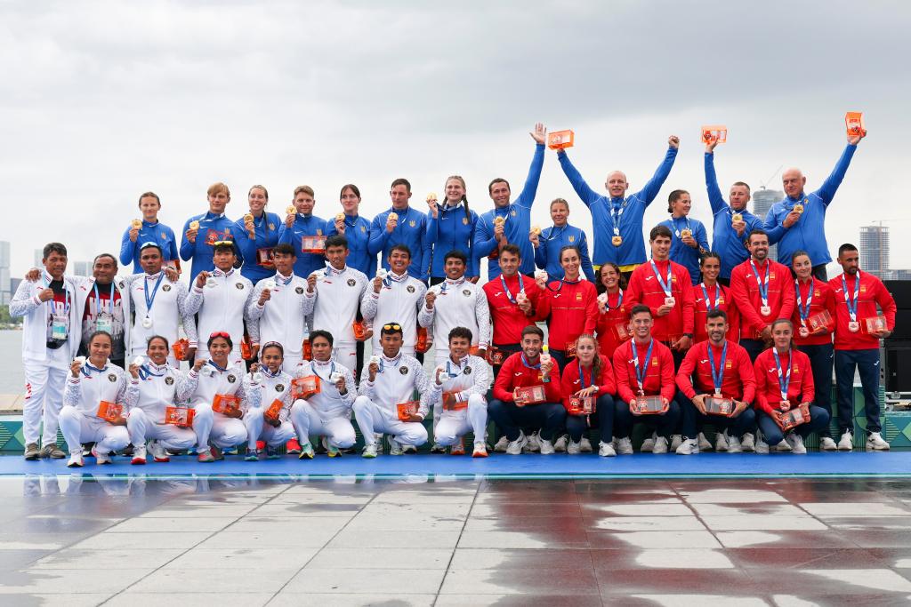 8月10日,冠军乌克兰队(后)、亚军印度尼西亚队(前左)、季军西班牙队(前右)在龙舟10人座2000米追逐赛颁奖仪式上。新华社记者 王翔 摄