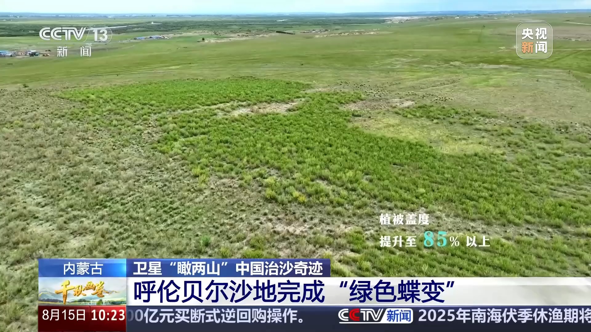 这里是内蒙古陈巴尔虎旗,位于四大沙地中最北部的呼伦贝尔沙地。时间退回到2019年,这里却是土地沙化的“生态重灾区”,流动沙丘与风蚀坑遍布。2020年,当地启动退化草原生态修复,现在修复区内95%以上的流沙面积得到有效控制,植被覆盖度提升至85%以上,实现了绿色蝶变。