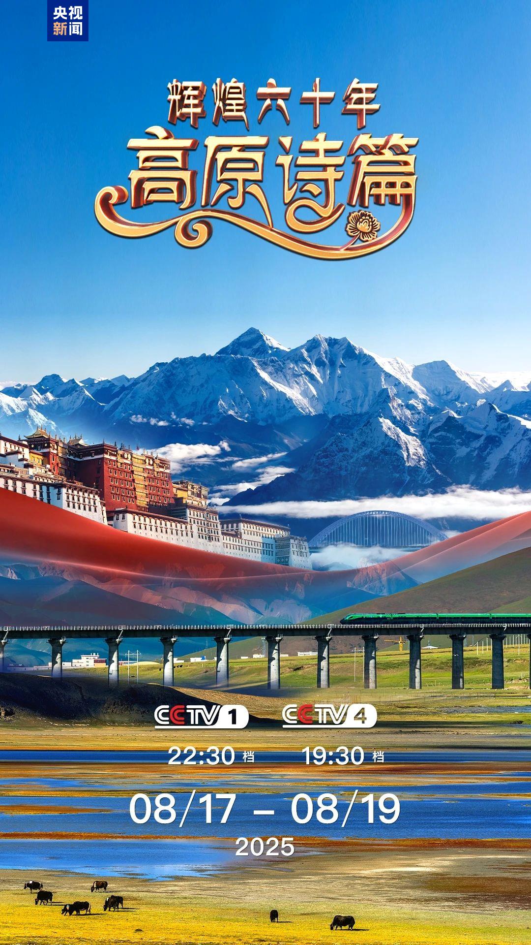 为庆祝西藏自治区成立六十周年,中央广播电视总台精心打造政论片《辉煌六十年:高原诗篇》,8月17日起,在总台央视综合频道(CCTV-1)、中文国际频道(CCTV-4)播出,央视新闻、央视频、央视网等总台新媒体平台同步上线。
