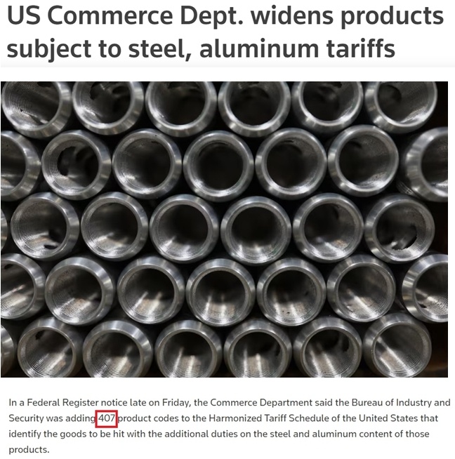 自即日起,美对进口钢铁和铝征收的50%关税范围进一步扩大,纳入汽车零部件、建筑材料、食品包装等数百种钢铝衍生产品。