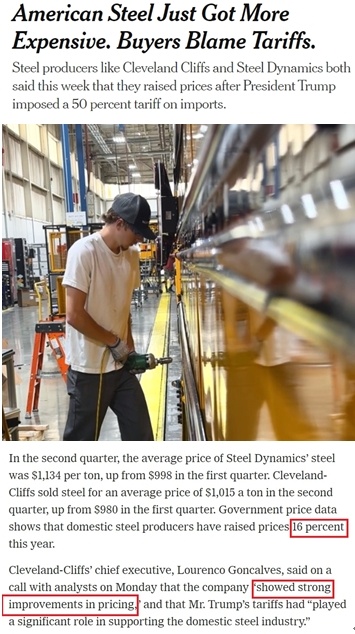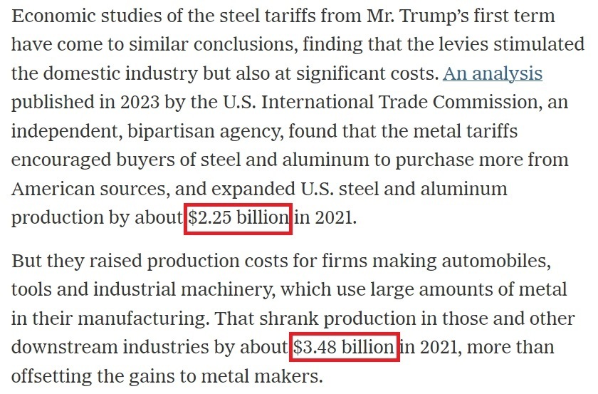 有经济学家直言,关税让美国钢铁生产商成了“利润最大化的企业”,而它们的提价“迫使制造从汽车到坦克等各种产品的国内制造商承担了新的成本”。