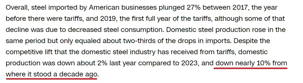虽然美国总统特朗普在他第一个任期就曾对进口钢铁加征了25%的关税,但研究显示,去年美国国内钢铁产量较十年前反而减少了近10%,竞争力也进一步下降。