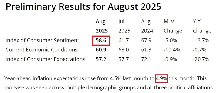 16日公布的最新报告显示,8月的美国密歇根大学消费者信心指数初值为58.6,低于7月的终值61.7,为四个月来首次下降。