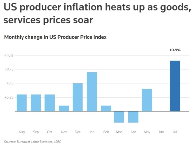 7月的美国生产者价格指数(PPI)涨得更厉害:同比上涨3.3%,为今年2月以来的最高水平;环比上涨0.9%,大幅高于6月的零增长和市场预期的0.2%,为2022年6月以来的最大涨幅。