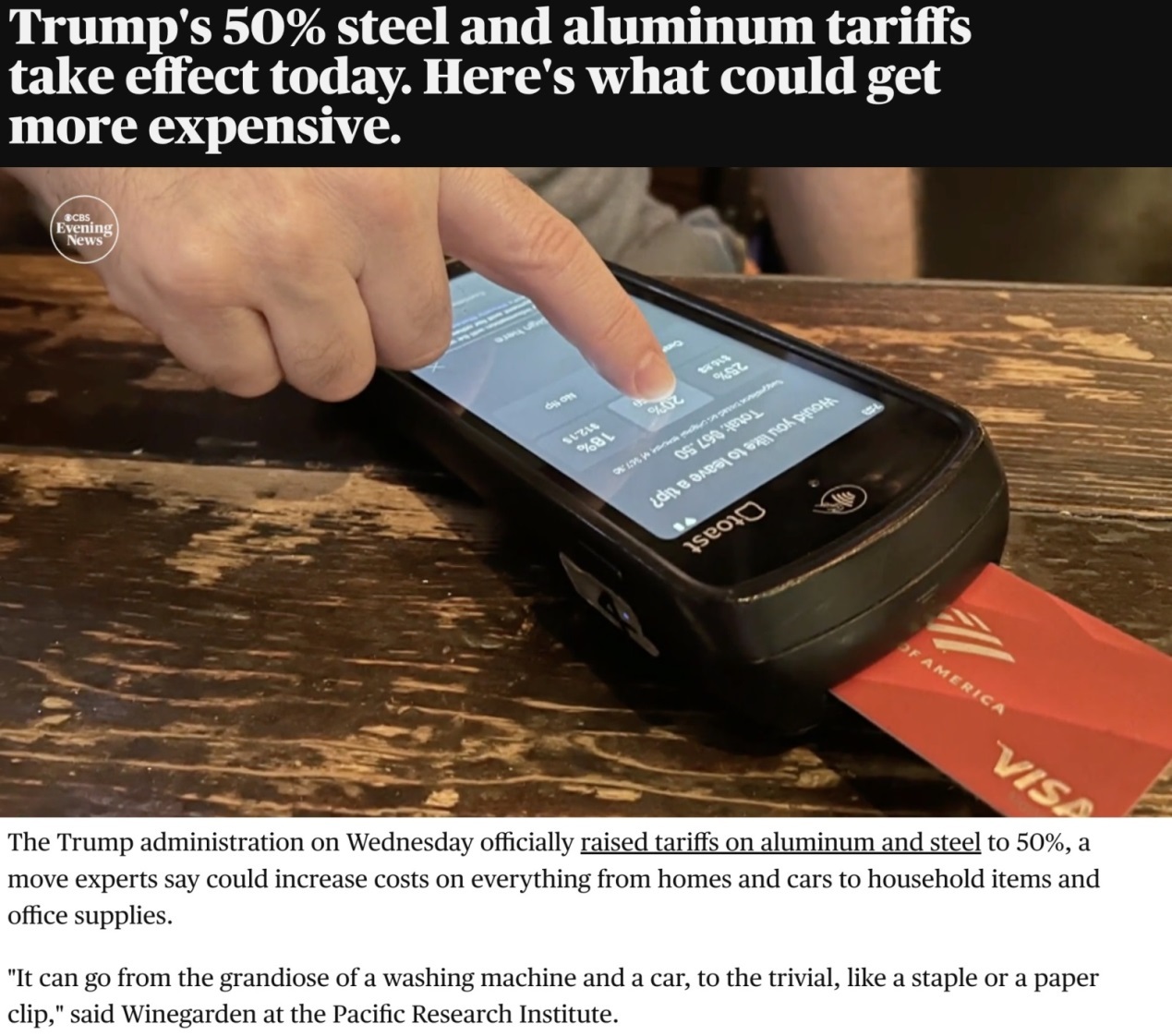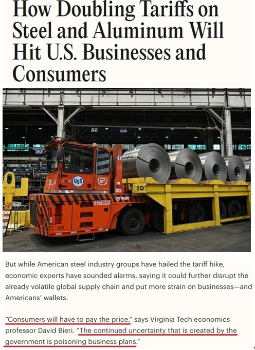 弗吉尼亚理工大学经济学教授大卫·比耶里进一步警告,随着美国政府将更多产品纳入高额钢铝关税征收范围,罐头食品、汽车、房屋和一系列其他商品很快就会变得更加昂贵,“美国消费者将不得不为此付出代价”。