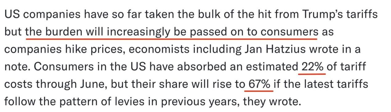 高盛集团此前的研究显示,截至6月,美国消费者已消化了大约22%的关税成本;如果美国政府加征关税政策延续,这一分摊比例可能在未来大幅上升到67%。