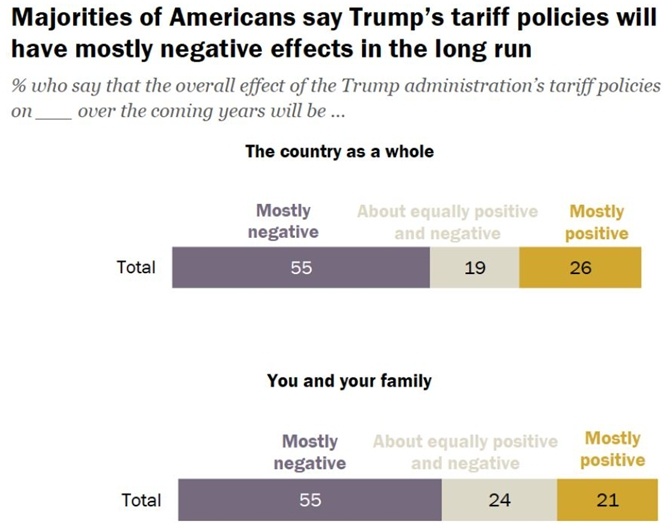 同时,认为关税政策的长期持续将对美国以及对自己家庭产生负面影响的受访者比例均为55%;相比之下,认为关税将对国家和家庭产生积极影响的受访者分别只占26%和21%。