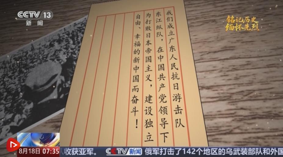 “我们成立广东人民抗日游击队东江纵队,在中国共产党领导下,为打败日本帝国主义,建设独立、自由、幸福的新中国而奋斗!”