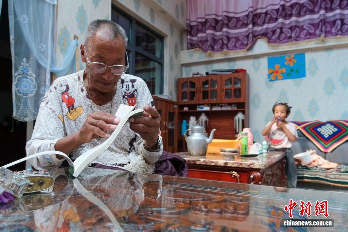 图为8月12日,达瓦次仁在森布日的家中翻看藏历,回忆在双湖的经历,他的身后是他的外孙女。江飞波 摄