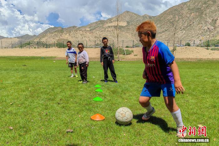 图为8月12日,一群双湖搬迁而来的儿童在森布日安置点一处草地上练习足球。江飞波 摄