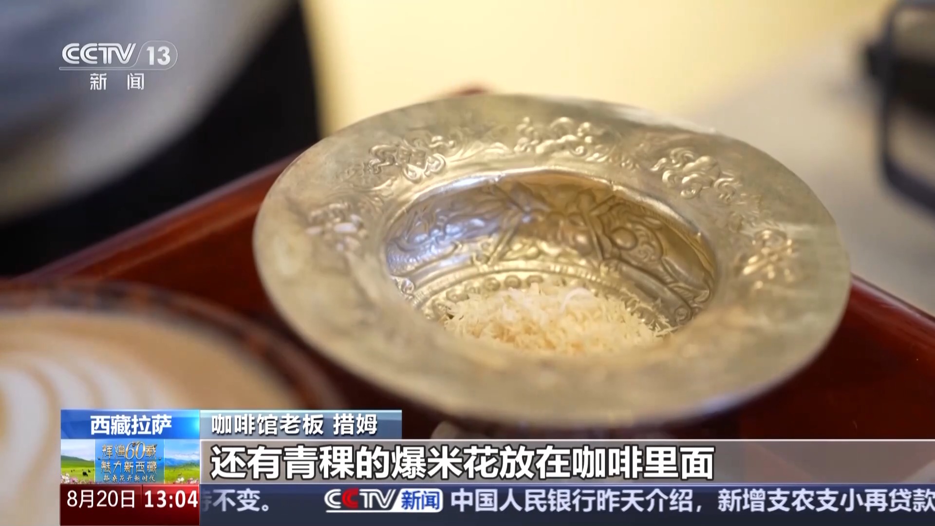 咖啡馆老板 措姆:这款是我们店里面卖得最火爆的一款原创产品——拉萨拿铁,我们准备了牦牛奶的奶渣、酥油、青稞的爆米花放在咖啡里,让客人体验到西藏本地食材和咖啡融合的感觉。